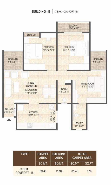 3BHK+3T (876.18 sq ft)
